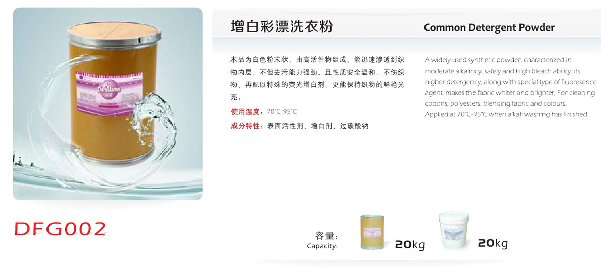 产品介绍产品图集 增白彩漂洗衣粉 型号:DFG002本品为白色粉末状,由高活性物组成。能迅速渗透到织物内层,不但去污能力强劲。且性质安全温和,不伤组织、再配以特殊的荧光增白剂、更能保持织物的鲜艳光亮使用温度:75-90成分特征:表面活性剂、增白剂、过碳酸钠